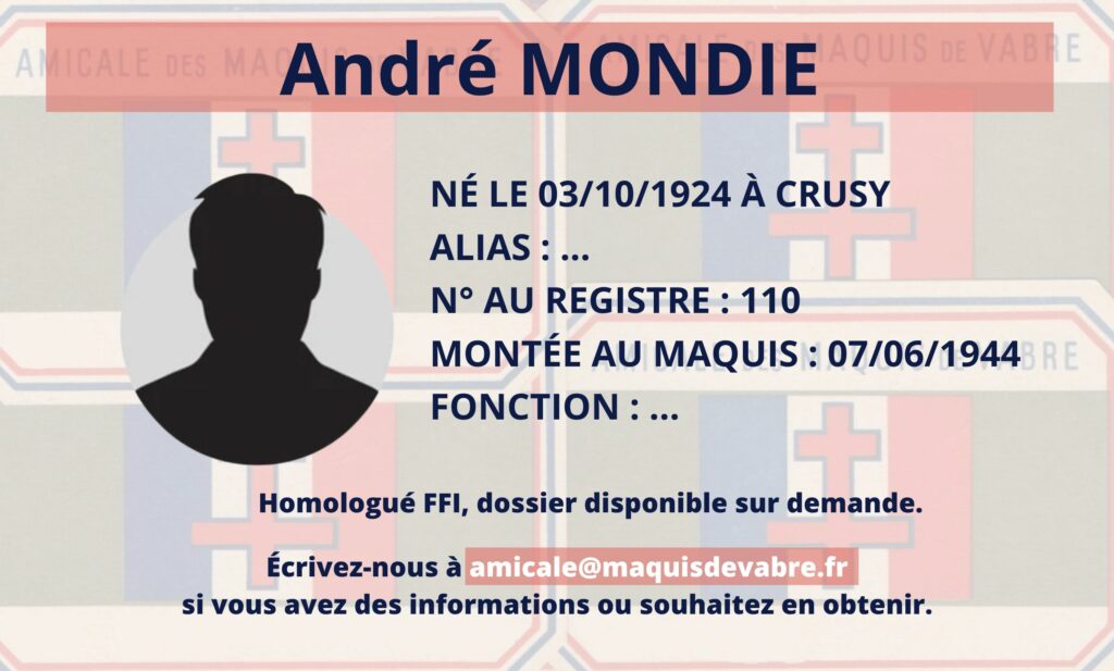 André Mondie, numéro 110 au registre des Maquis de Vabre. Dessinateur. Membre de la troisième section de la première compagnie.