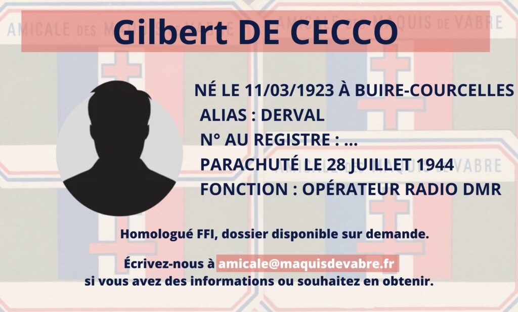 Gilbert De Cecco, alias Derval / Bulies, non inscrit au registre des Maquis de Vabre.