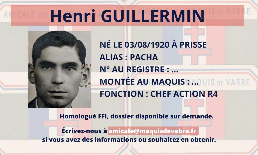 Henri Guillermin, alias Pacha / Merle Blanc, non inscrit au registre des Maquis de Vabre.