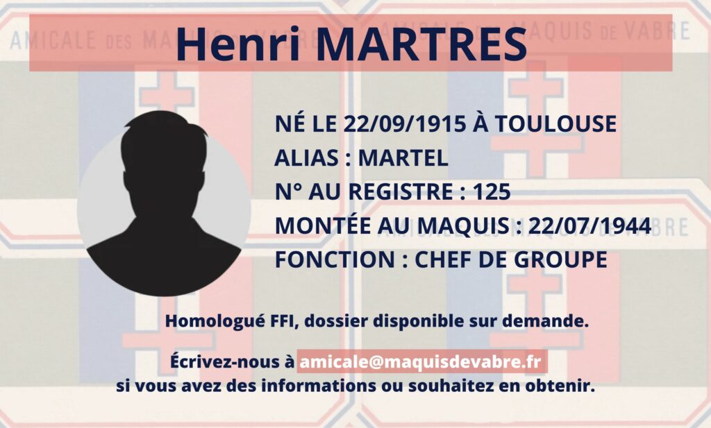 Henri Martres, alias Martel, numéro 125 au registre des Maquis de Vabre. Militaire de carrière.