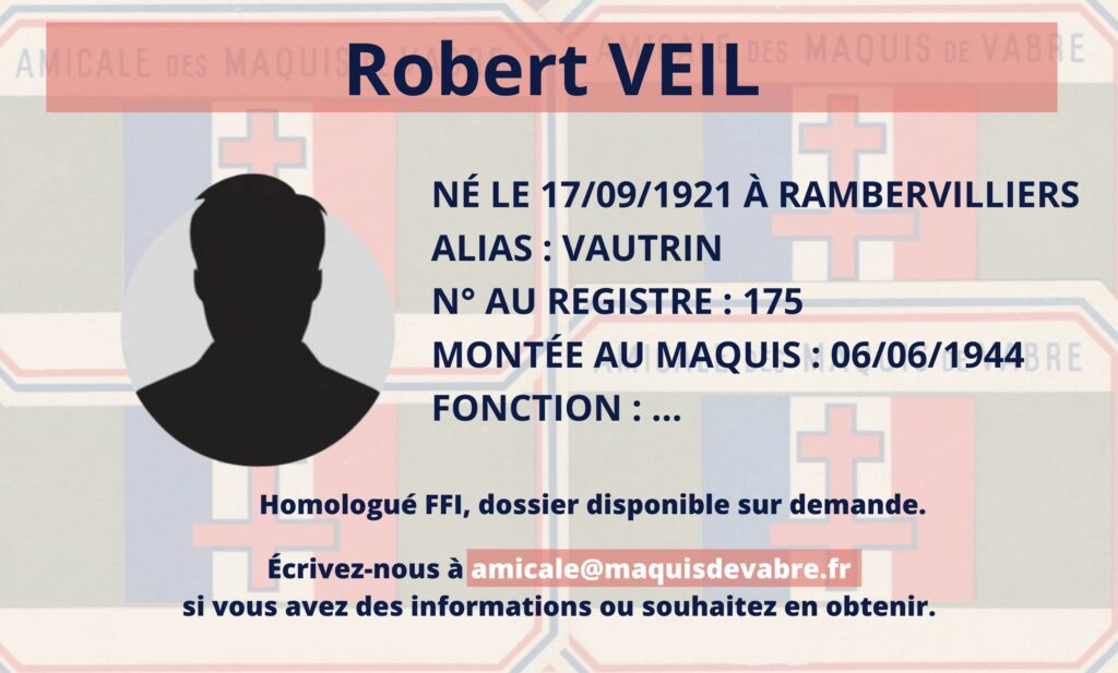 Robert Veil, alias Vautrin, numéro 175 au registre des Maquis de Vabre. Négociant en chevaux. Membre de la première section de la deuxième compagnie.